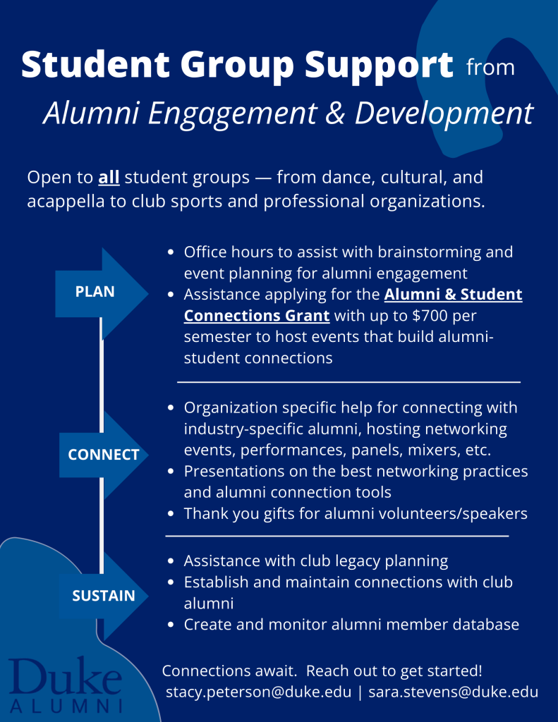 The Engagement & Advocacy committee has been working with the Duke Alumni Student Connections Student Ambassadors to identify a disparity on campus: many student organizations are not aware of the resources available through Duke Alumni Engagement and Development. Similarly, many Duke Alumni are eager to engage with student organizations but feel unable to locate and contact specific student organizations.